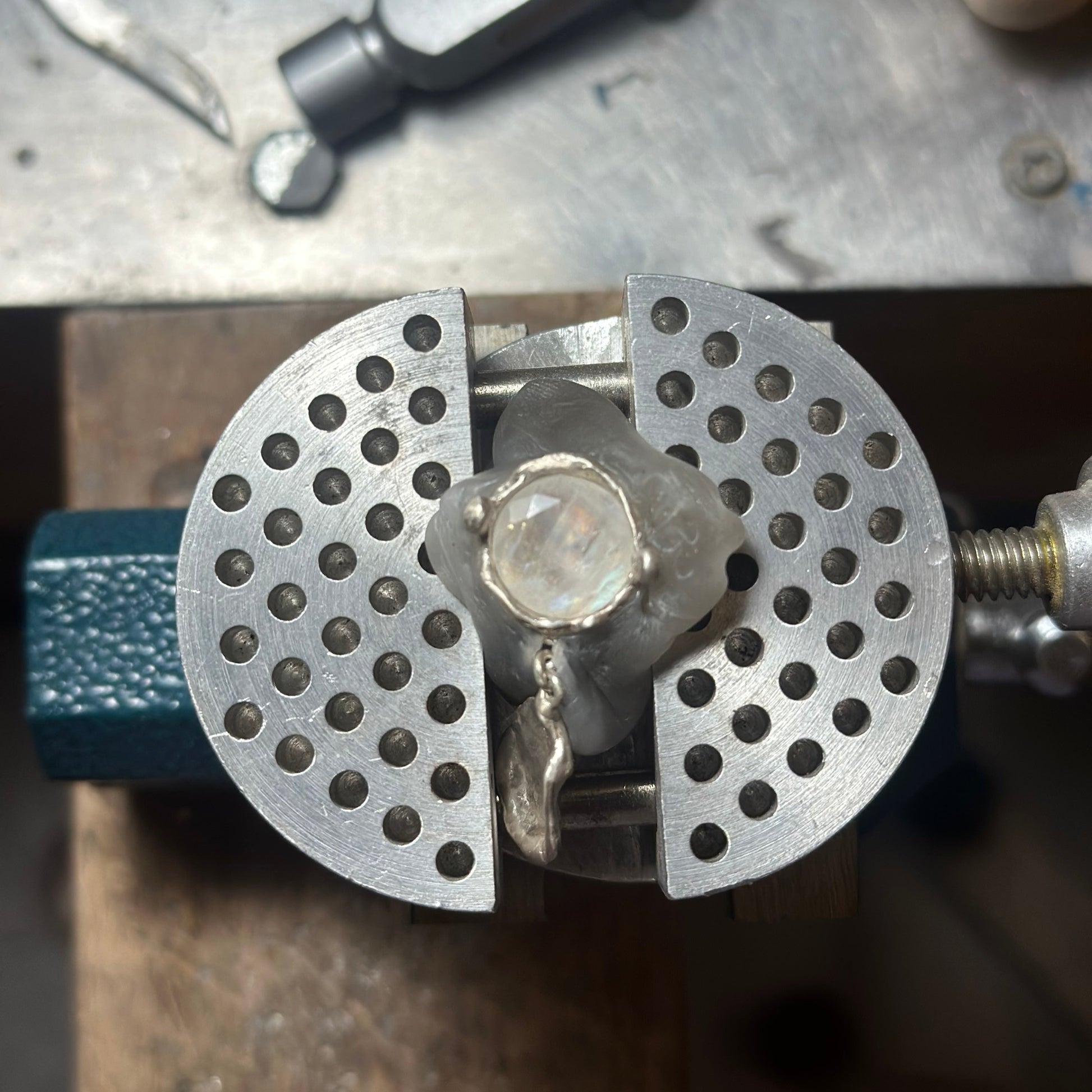 Studs featuring a Moonstone with a beautiful reflection, paired with organic water-cast silver drops. The two pairs are slightly different.